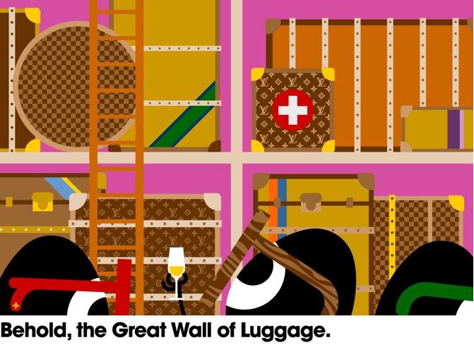 A fearsome crowd of paparazzi gathered outside the shimmering, gold-mesh façade (which spans half a block on the corner of New Bond Street and Clifford Street), while Marc Jacobs welcomed friends—including Gwyneth Paltrow, Kirsten Dunst and Jerry Hall—to the store’s decadent, art-strewn spaces, designed by architect Peter Marino to resemble the well-stocked archives of a connoisseur collector. Among the pleasures on offer across the Maison’s three floors are a dizzying display of vintage Vuitton trunks; works from Gilbert & George, Takashi Murakami and Richard Prince; an exhibition of Vuitton ready-to-wear curated by super-stylist Katie Grand; and, on the ground floor, a wall display of handbags that shifts and revolves, as if by magic.